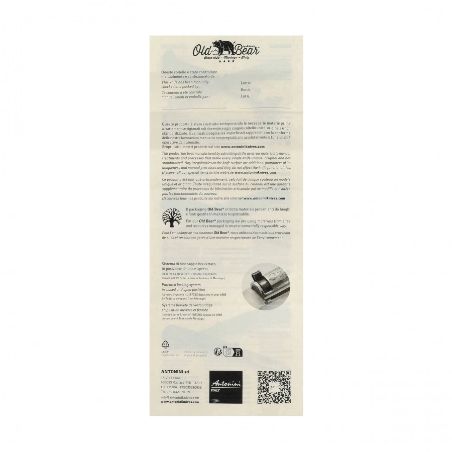 Each knife in the series Old Bear® is handmade in Maniago, the Italian capital of knife making. The artisanal approach gives each piece its own unique character. Slight differences in wood grain or surface finish emphasize the authenticity and individuality of each model. It is an ideal choice for those who appreciate real quality and traditional workmanship.
