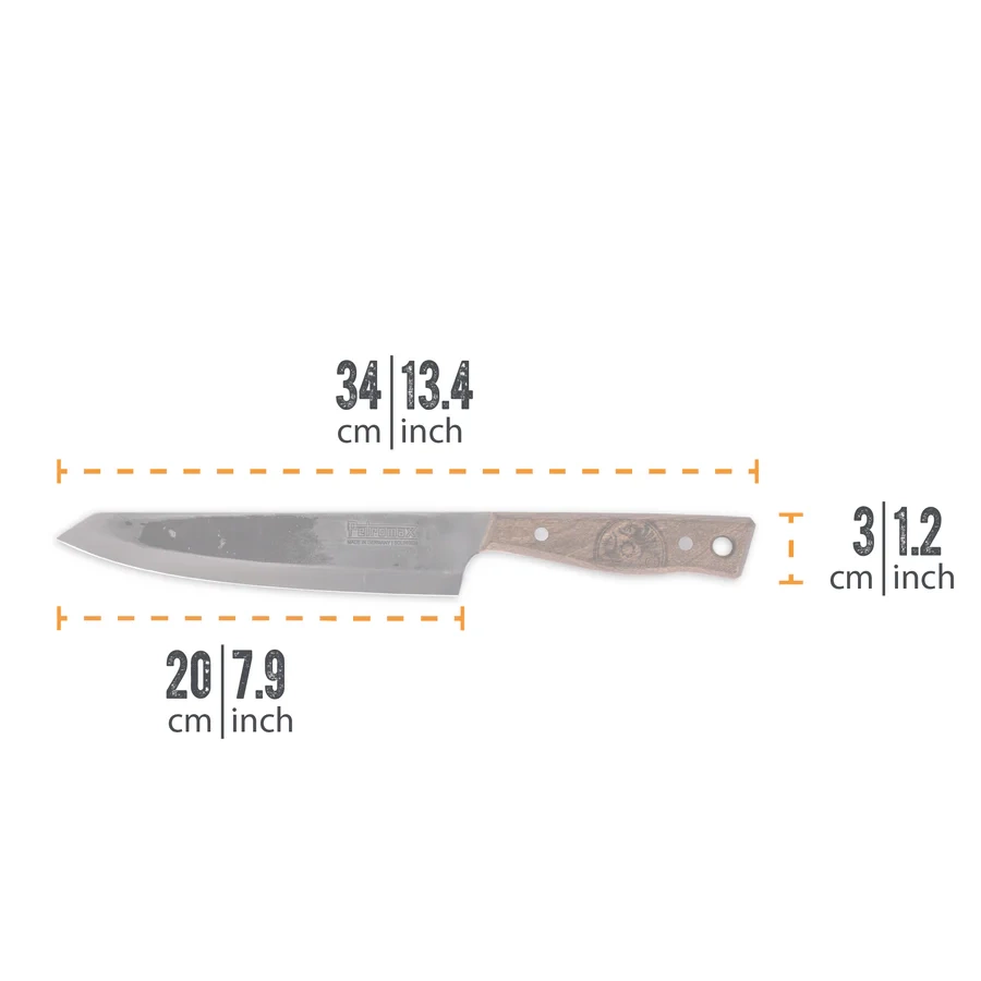 The Petromax chef's knife is a handmade in Solingen, Germany, all-purpose stainless steel knife that is perfect for slicing vegetables, filleting fish, portioning meat and chopping herbs. With a 20 cm long, 3 mm thick blade, you can easily handle any ingredient in the outdoor kitchen.