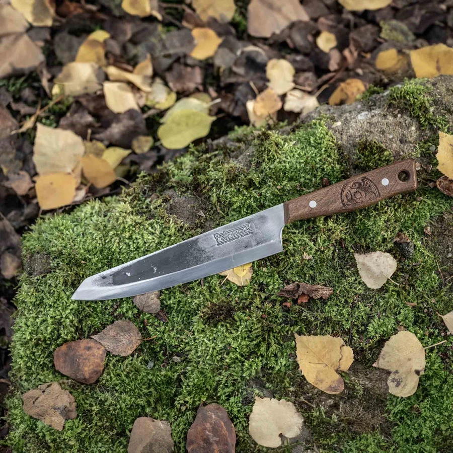 Thanks to the use of high quality steel and solid shank, the knife has excellent durability and wear resistance. The walnut wood handle has been riveted seamlessly for a secure grip and hygienic use. The oxidized surface of the blade gives the knife not only a unique look, but also an extra layer of protection.