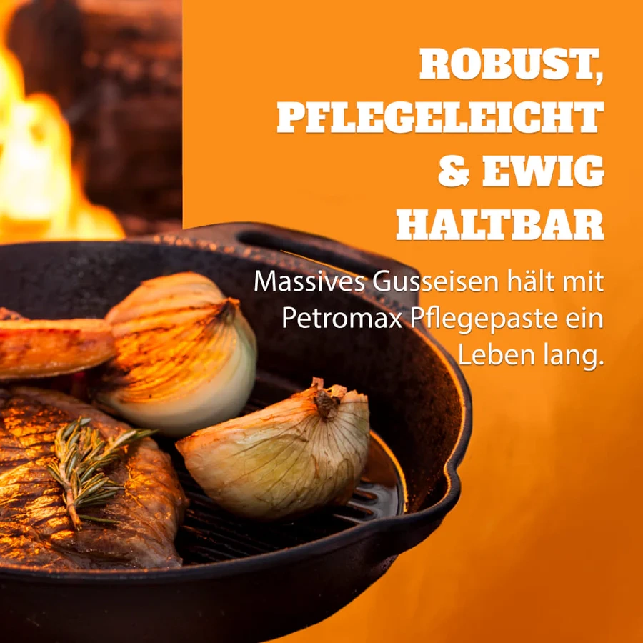 Petromax frying pan made of high quality cast iron is indispensable for meals over an open fire and in the home kitchen. Because cast iron pans are extremely durable, professional chefs also use them. Once you try them, you won't want to do without the fire pan and its many benefits.