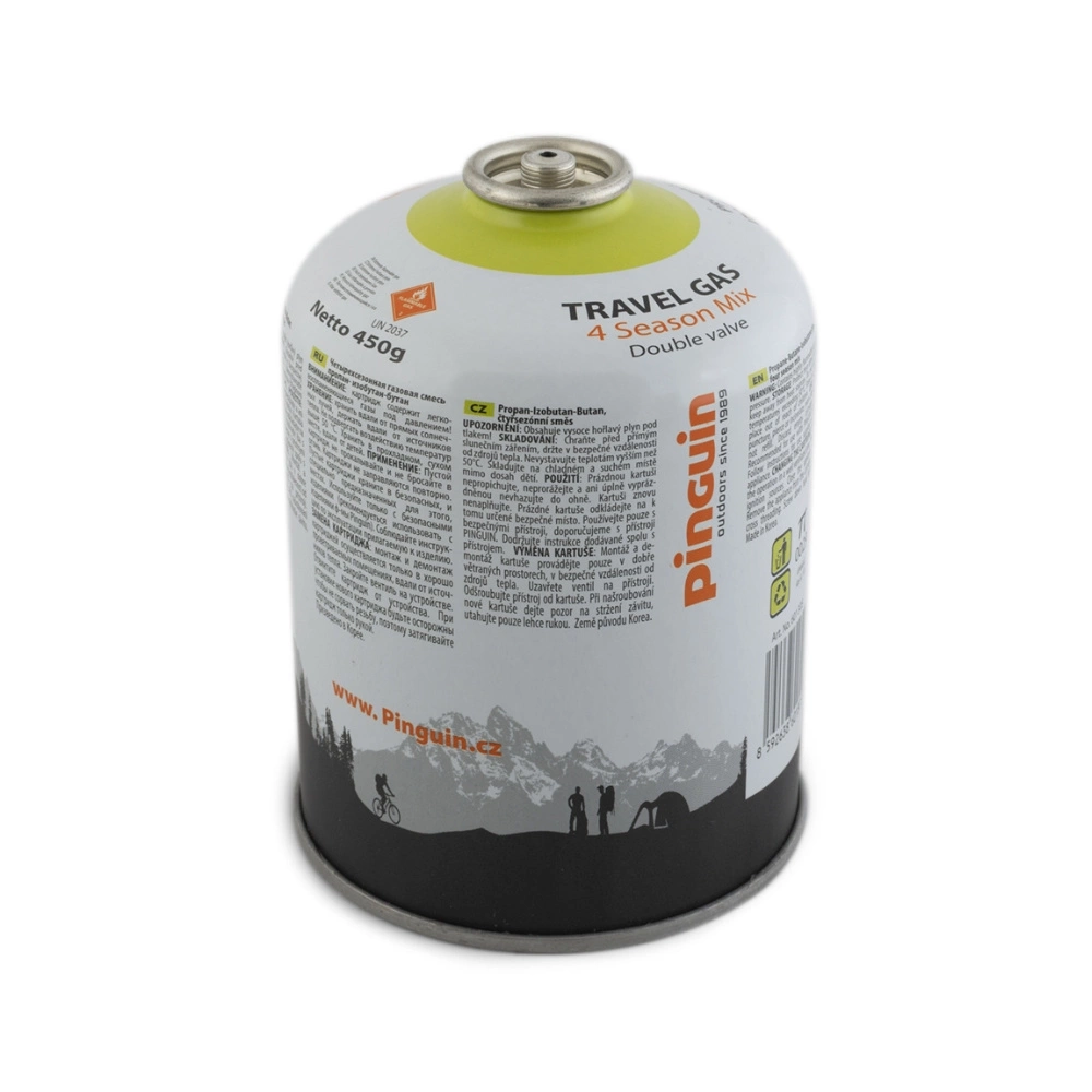 Pinguin Travel Gas - 450g gas cartridge, whose wfilling is a mixture of Propane/N-Butane/Isobutane gases, which provide constant pressure in the cartridge even at low temperatures and at the same time a very low outgassing value. Thanks to this the mixture can ignite as low as -40°C.