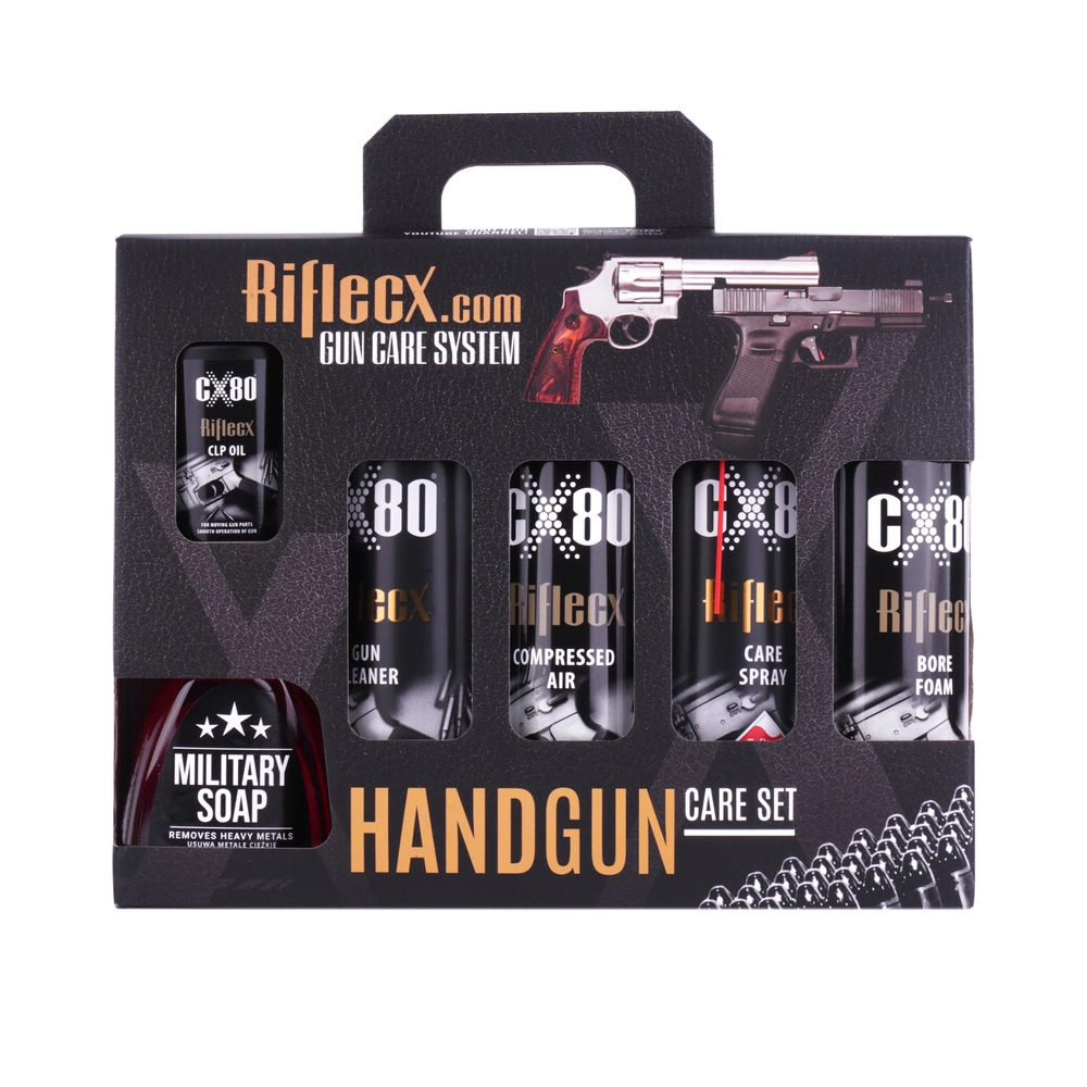 RifleCX Handgun Set 90982 is an eight-piece complete set created specifically for cleaning and maintaining small arms. Enclosed in an elegant cardboard case, it will be perfect for both regular gun care and as a gift for the shooter.