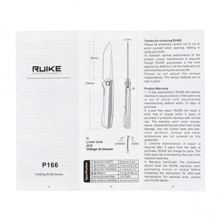 Ruike P166-AB is a full-size folding knife designed for everyday use. Combines comfort, durability and refined design. The blade is made of Sandvik® 14C28N steel, which provides corrosion resistance and long-lasting sharpness. The anodized aluminum handle is lightweight, durable and fits well in the hand, while the Liner Lock ensures safe operation.