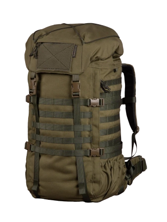 Multi-purpose multi-day backpack with internal aluminum frame for carrying heavier loads. Scalable and compressible to adapt to changing wearing needs. Capacity of the main bag approx. 40 liters, with additional space in the lid and multiple external attachment points for additional side pockets and gear.