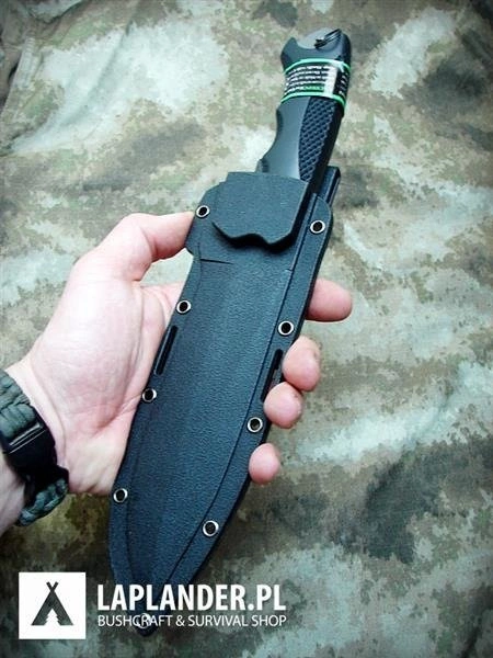 Drop point blade with full tang design and 4 mm thick is made of high carbon 8Cr13Mov stainless steel. Head coated with a layer of titanium protecting against corrosion and glare and making it easy to clean. At the top of the blade there are large serrations.