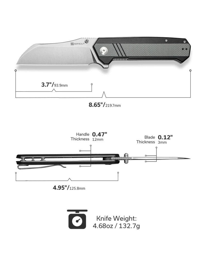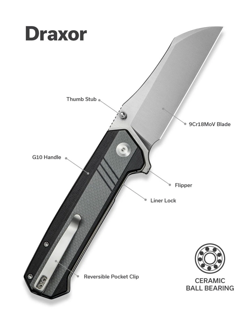 - Draxor Gray/Black G10, Satin, excellent folding knife E.D.C. with a wharncliffe head made by Sencut. Compact knife with durable, wide 9Cr18MoV steel blade and reversible clip. Straight G10 composite handle. Bestseller!