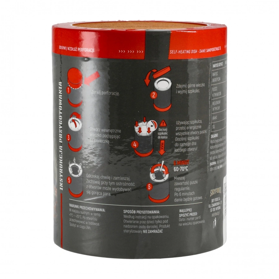 Thanks to its sterilization and lack of preservatives, SKYFOOD stew will be perfect as a part of survival gear, car equipment or home food reserve. The compact can easily fits in a backpack, and when the heating system is activated, it quickly turns into a hot, filling meal.
