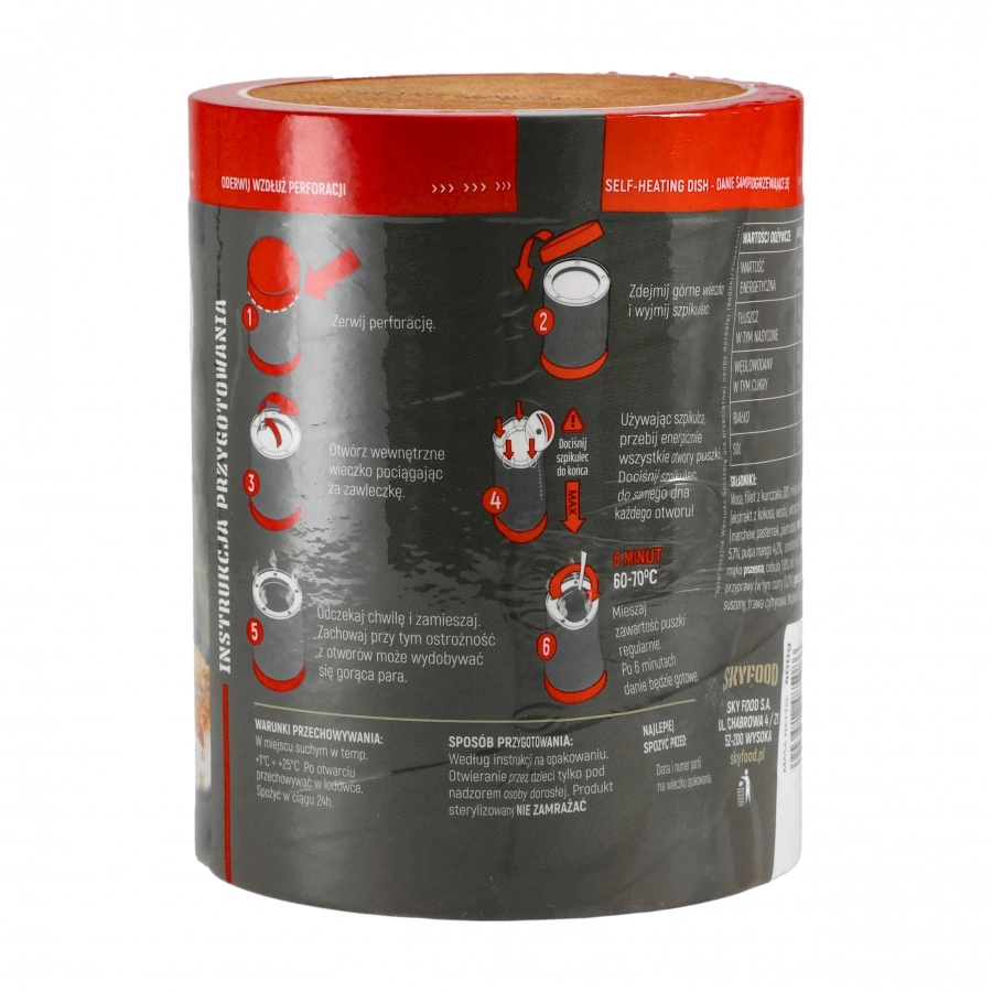 Flavor profile sweet and spicy curry-mango, balanced with creamy cream and coconut milk, it quickly satiates, warms and raises energy levels. Activation of the heating insert takes a few minutes - after a while you enjoy a hot, aromatic meal no pots and pans or washing up. Perfect for mountain expeditions, rafting, long car journeys or emergency situations.