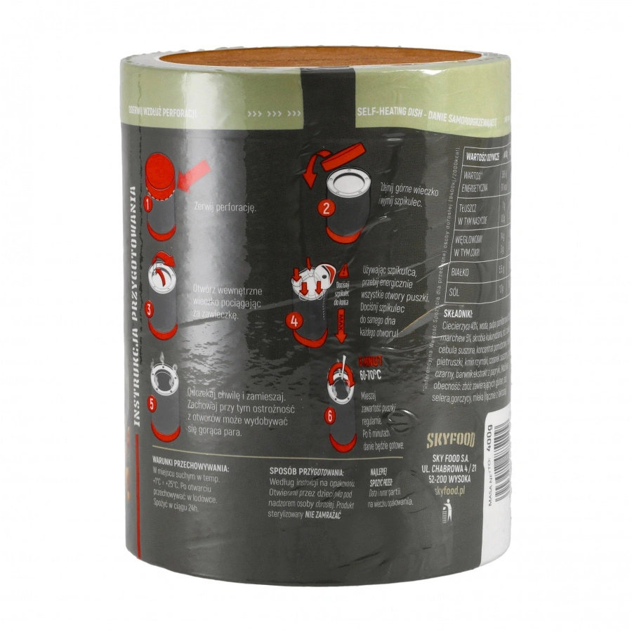 The sturdy can with a self-heating system performs well in all weather conditions, and the whole thing forms a a full-fledged "ready to eat" meal, which you can eat directly after heating. This solution is especially appreciated when others are just organizing the cooking.