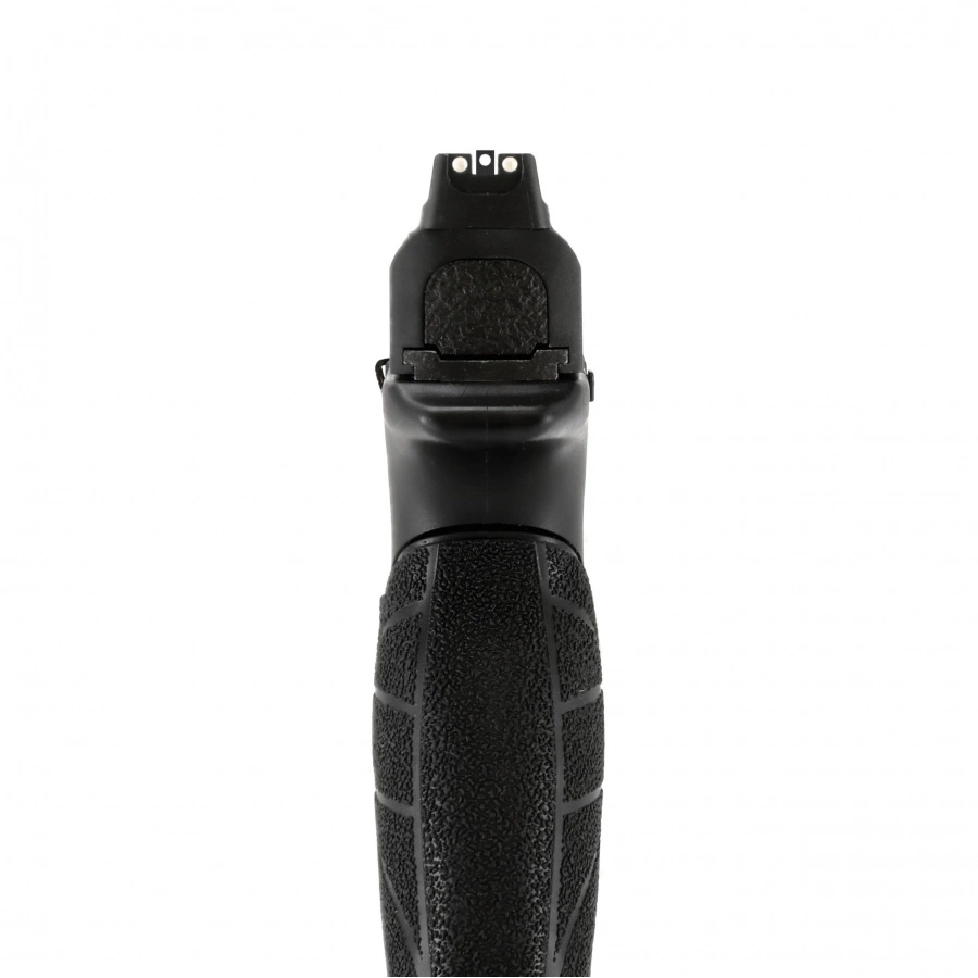 Equipped with metal lock with porting, interchangeable handle caps, high aiming instruments and blow-back system, which mimics the recoil of a firearm.