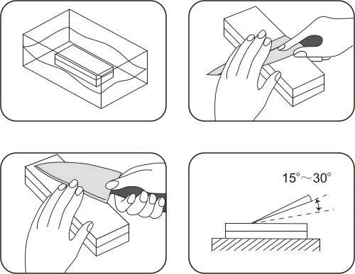 To start sharpening, simply soak the stone in water or use sharpening oil. Guide the blade along the surface of the sharpener at an angle of 15-30 degrees, evenly and without haste. For those who value even greater precision, an angle guide (sold separately) is available to help maintain a consistent sharpening angle.