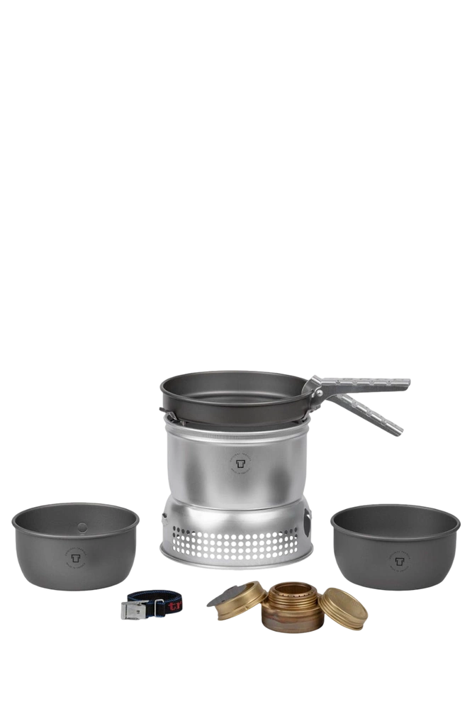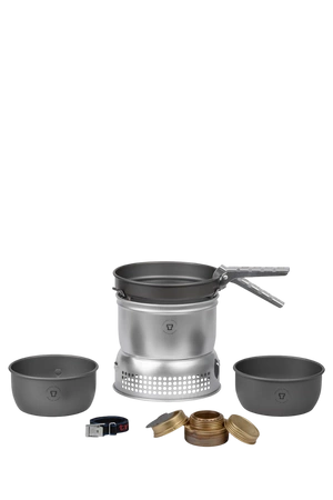 TRANGIA STOVE 25 (LARGE) is a larger stove, ideal for 3-4 people. All 25 series stoves include two saucepans with a capacity of 1.75 and 1.5 liters, a frying pan, a wind shield (top and bottom base), burner, handle and strap. Depending on the model, it comes with travel kettle 0.9 liter, spirit or gas burner. The collection includes several complete combinations with different materials used in the manufacture and finishing of pots, pans and wind shields. The dimensions of all 25 Large stoves are the same: when packed, they are 22 cm in diameter and 10.5 cm high.