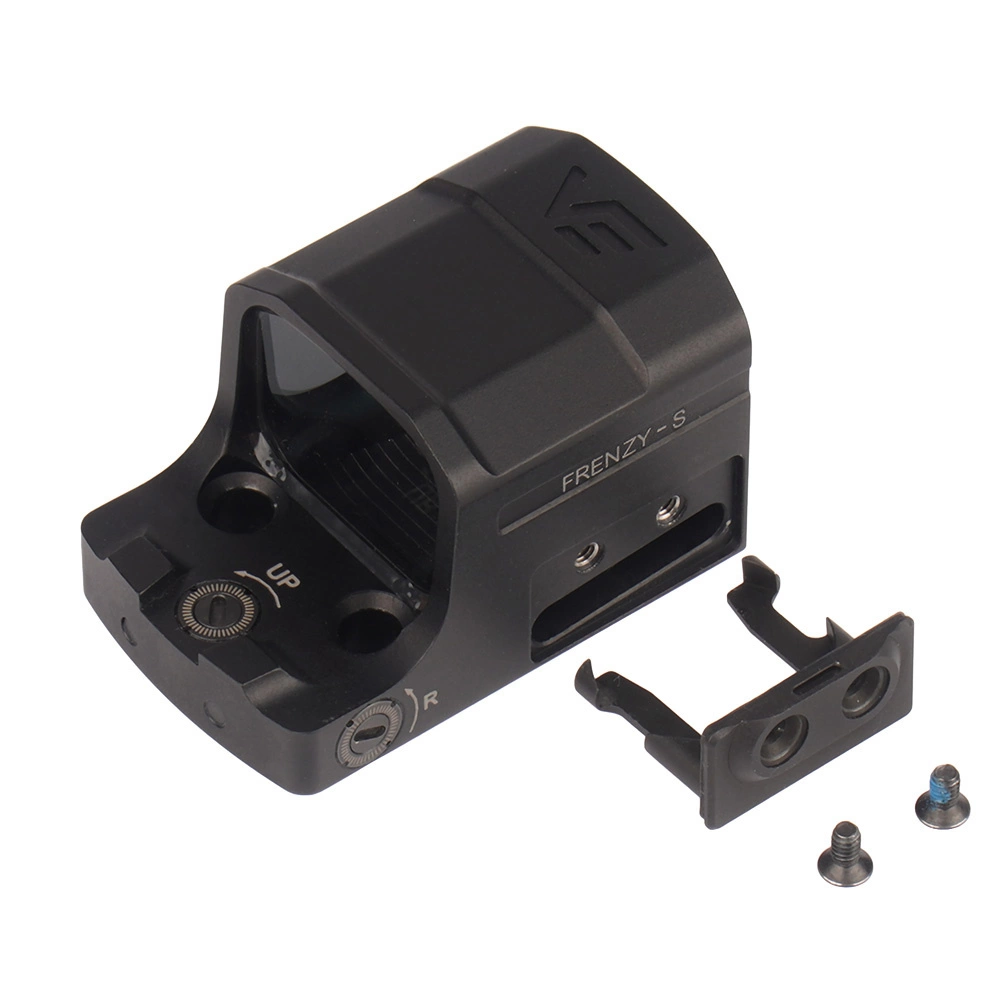The Frenzy Plus features a motion sensor that saves battery life by shutting down the device when no motion is detected. The collimator can operate in a temperature range of -20°C to +60°C. An MGT plate is included for mounting on a Weaver rail. The collimator has a standard-sized target window with an area of 17x20 mm. The mounting plate is compatible with the MGT standard.