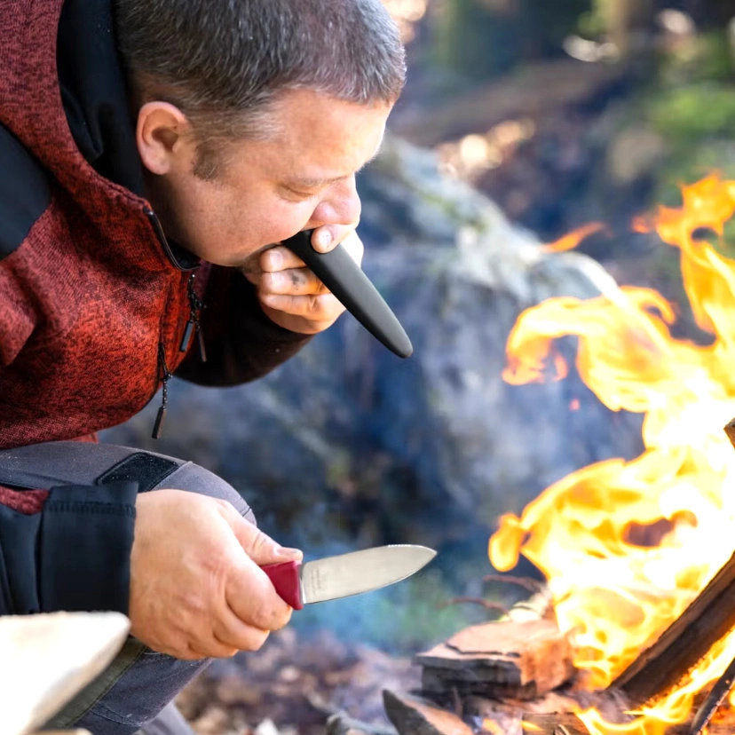 The knife comes with a polymer sheath with locking type click. It can be conveniently attached to a belt up to 60 mm wide. An interesting addition is the two holes on the bottom, which allow the sheath to be used as a blowers to light a campfire.