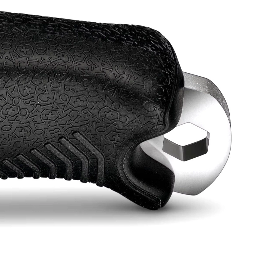 The sturdy skeleton with an exposed metal foot was shielded in the grip area by a contoured polymer handle. Texturing composed of small Victorinox logos improves grip stability, even in wet conditions.