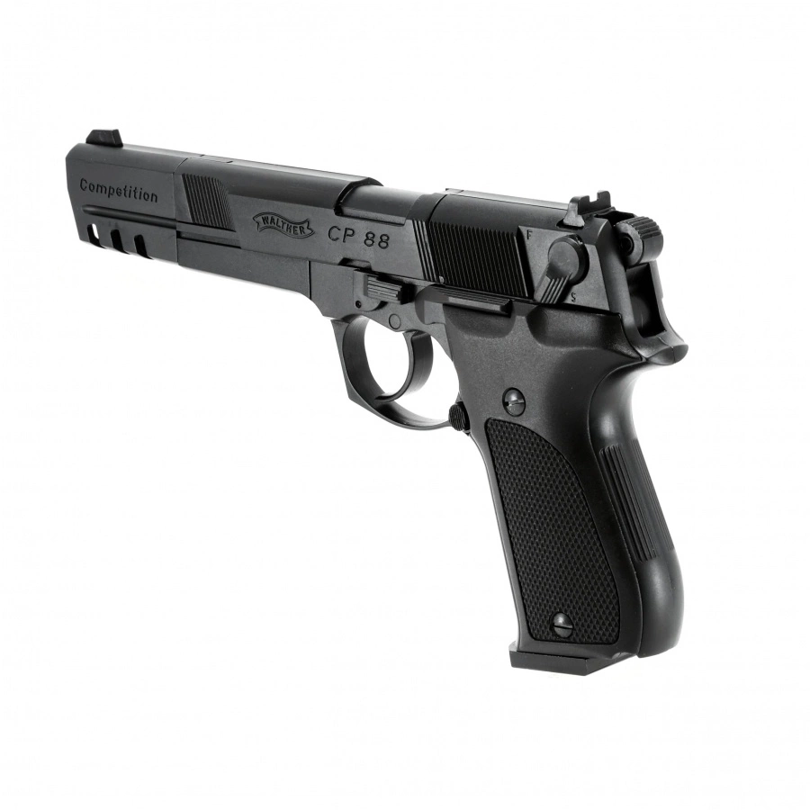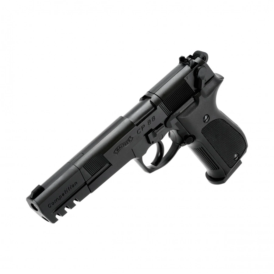 The Walther CP88 Competition 4.5 mm Diabolo CO₂ model is a sports version of the well-known air rifle, equipped with an extended threaded barrel and a striking compensator. The design allows for shooting diabolo type shot, and additional features include a double-sided safety and an ergonomic grip with non-slip facings.