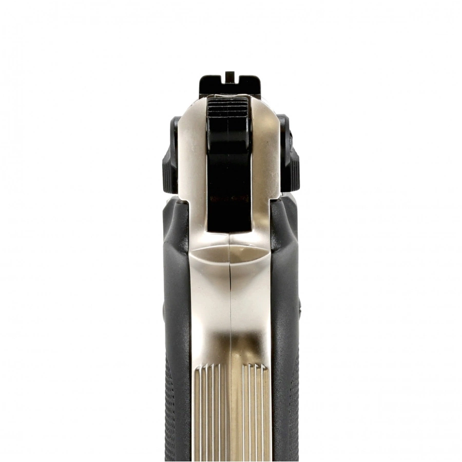 The model is powered by a standard CO₂ capsule with a capacity of 12 g, placed in the handle. The use of compressed gas provides an initial velocity of up to 120 m/s and enables effective shooting at distances of up to 20 meters.