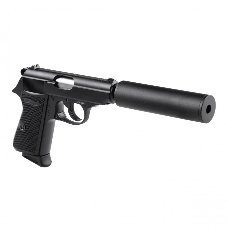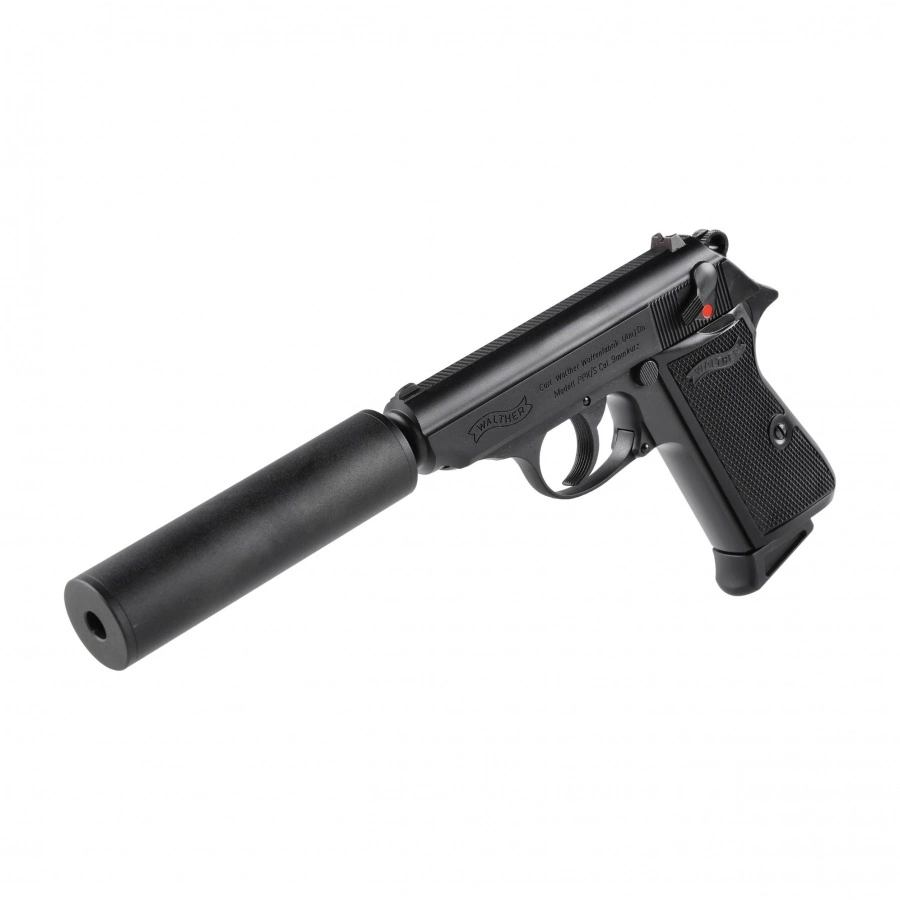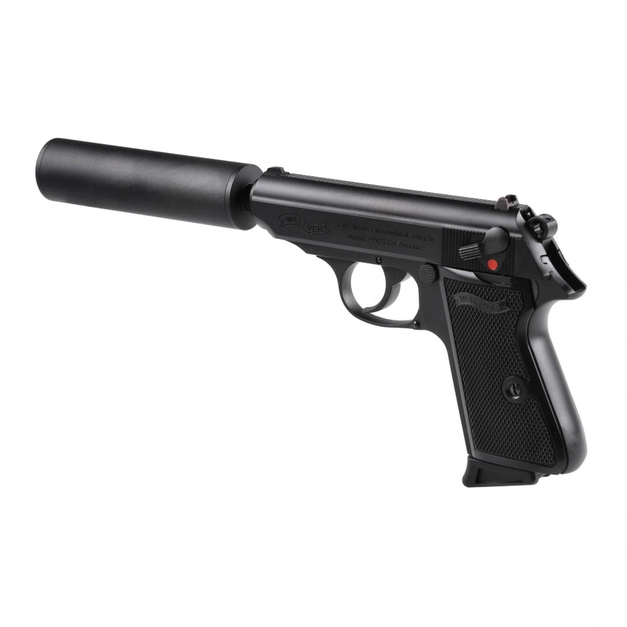Walther PPK/S 6 mm with silencer it's aSG gas replica of the iconic pistol, made famous by the film Agent 007. The structure was made made entirely of metal, a enlarged magazine foot makes the gun secure and stable in the hand of the shooter.