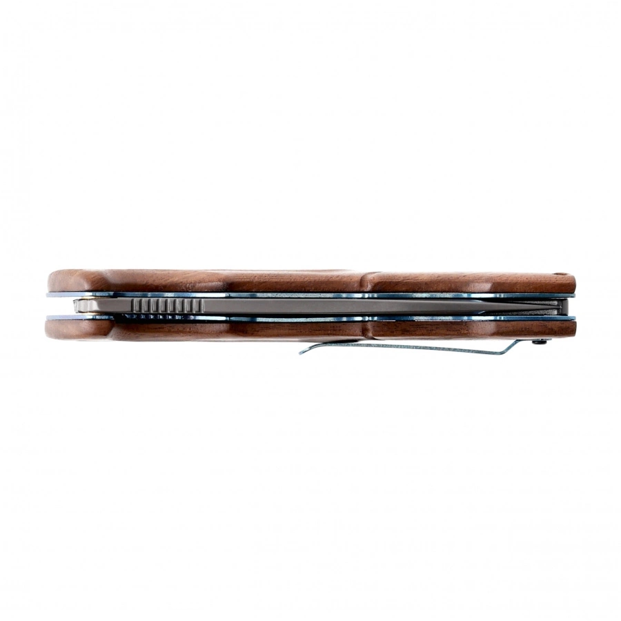 Walnut wood handle - matte finish, contoured shape with finger cutout for improved grip comfort, anodized blue reinforcing inserts (liners).